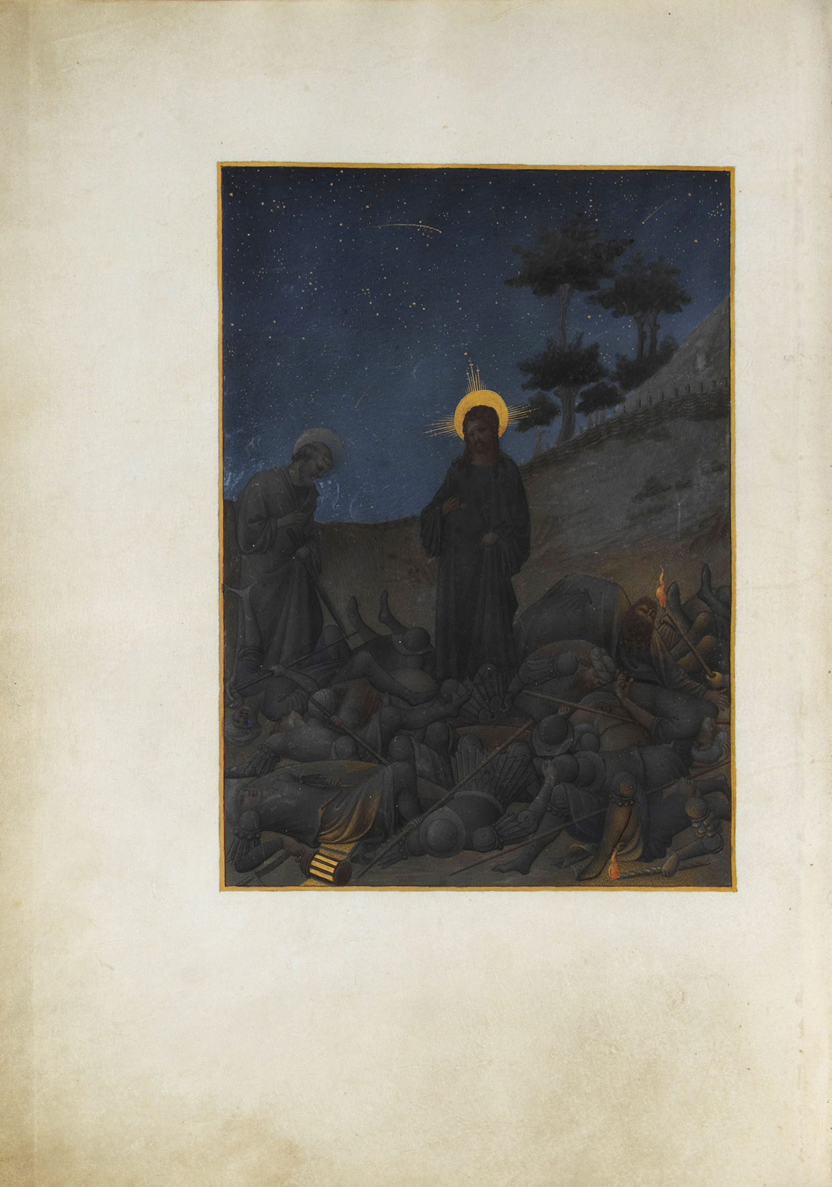 Het begint met een mysterieuze nachtscene in het hof van Getsemane, de tuin aan de voet van de Olijfberg, waarin Christus aureool als een zon tussen de sterren de nachthemel verlicht. Als je heel goed kijkt zie je dat in de stralen al een voorafspiegeling van de drie kruizen van Golgotha zichtbaar zijn. Vallende sterren en de toortsen van een paar in zwijm gevallen soldaten geven het geheel een spannende diepte. Het is de nacht dat Jezus wordt verraden en uitgeleverd. Lijdzaam overdenkt hij zijn lot.